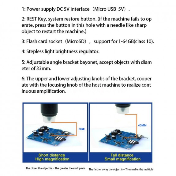 Video có thể được lưu vào thẻ nhớ flash (vui lòng sử dụng tốc độ thẻ loại 10, thẻ không được bao gồm.) Khoảng cách đối tượng: 10mm đến vô cực (các khoảng cách đối tượng khác nhau tương ứng với các bội số khác nhau.)